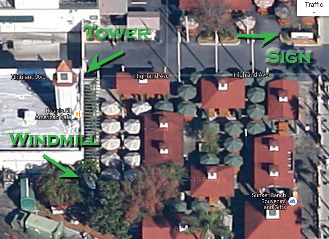 I took a step back, then crossed to the other side of Sunset Boulevard and surveyed the ranch. Tower, check. Buildings, check. Windmill… nada.