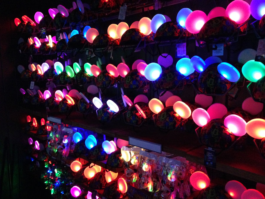 And last but not least, we have the Glow With the Show ears, whose latest synchronization is with the Osbourne Festival of Dancing Lights and Dinner Theater Extravaganza. There were only, like, two people wearing them, but I thought the little booth with all the (plentifully oversupplied) ears looks really awesome at night. Especially amid all the other lights on New York Street.