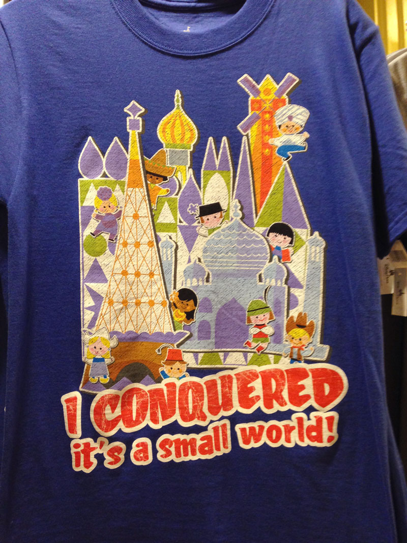 That one is genius. I am usually the guy who hates it when other people make Small World jokes (“They should turn it into a shooting gallery ha ha ha”). But this one is the right amount of irreverent. It mocks those E-ticket roller coaster shirts, while also pulling double-duty for those people for whom Small World is an endurance test. All kinds of mad props for this one.