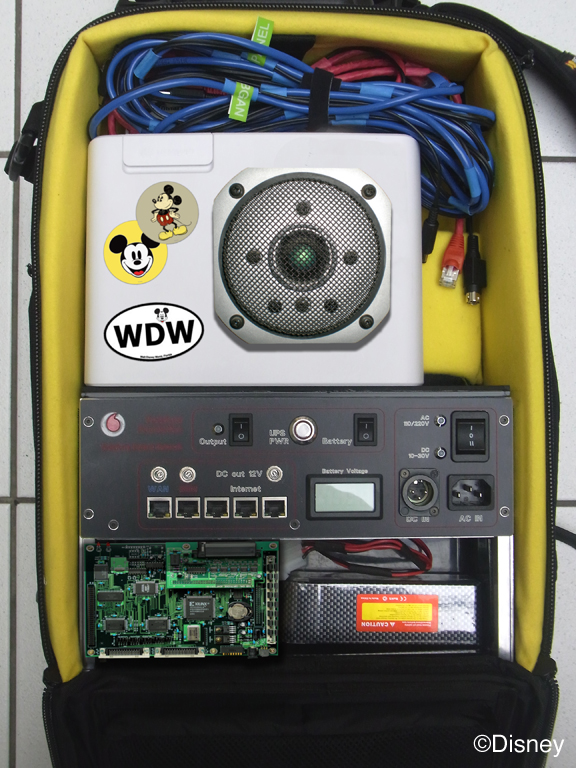 The MyMagic Backpack+++ system is a technological marvel. Each fashionable backpack (available in a wide assortment of designer colors and styles) contains well over 30 pounds of high-tech audio, video and biomechanical guest monitoring gear as well as lithium ion rechargeable batteries to power the rig. Batteries are good for up to four hours and then will require a brief thirty-minute recharge from one of the several MyMagic Backpack+++ recharging stations guests will find throughout the parks.