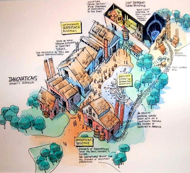 I’m possibly in the minority here, but I find the designs for Disney’s America to be very lackluster. I mean, these are their ideas? A Lewis & Clark (off-the-shelf) white water ride? A rollercoaster through a steel mill? A Monitor v. Merrimack water stunt show? A lot of this stuff reeks of brainstorming session cast-offs. They are like literally the worst things to pick if you wanted to make a theme park about America. I can come up with about 20 rollercoaster ideas before I land on “steel mill.”